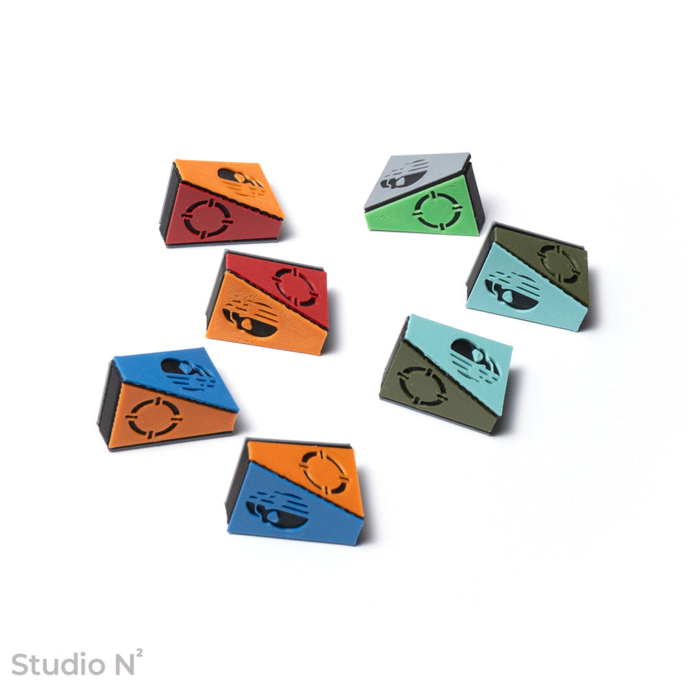 公式では隠密用・戦闘用それぞれに行動前/行動後のトークンを用意する必要があるため、ミニチュア1体につき2種類のトークンが必要でした。5体編成なら10個のトークンを持ち歩くことに。このトラッカーならスタンスと行動状態を1つに集約できるので、トークン5個だけで済みます。